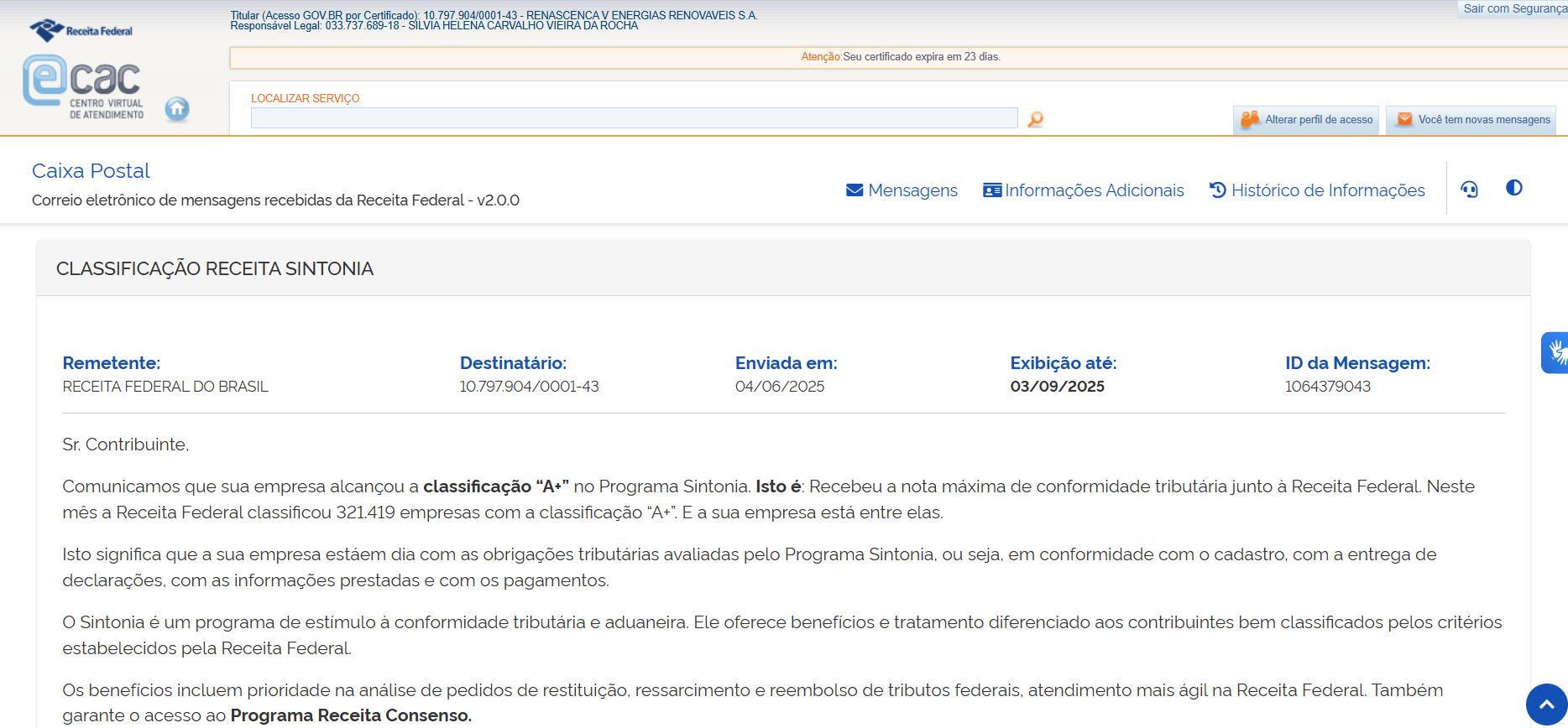 巴西公司下屬項目公司獲得巴西稅務(wù)最高評級A+